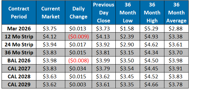 The February contract expired yesterday and settled at $7.46/MMBtu. The NYMEX March contract closed at $3.73/MMBtu yesterday, a $0.08/MMBtu decrease from Tuesday’s close. This week, March has averaged $3.80/MMBtu, around $0.47/MMBtu above last week’s average of $3.33/MMBtu. It is trading at $3.75/MMBtu, up $0.01/MMBtu from the previous day’s close.Natural gas prices remain volatile as freeze-offs impacts ease across much of the southern U.S., allowing production to rebound while cold-driven demand stays elevated across key consuming regions. L48 output has recovered to roughly 103-104 Bcf/d, with remaining freeze-offs estimated near 6 Bcf, though renewed sub-freezing temperatures moving into the Permian and Haynesville this weekend could trigger additional short-term disruptions. LNG feedgas nominations have strengthened to ~19.5 Bcf/d, with most facilities back online aside from Elba, and expectations building for initial liquefication at Golden Pass by early March following recent regulatory approvals. ResComm demand has softened modestly on milder weather in the South but is expected to rebound into the weekend as colder temperatures spread into the South Central, while demand across the East and MW remain well above seasonal norms and should persist for at least two weeks.