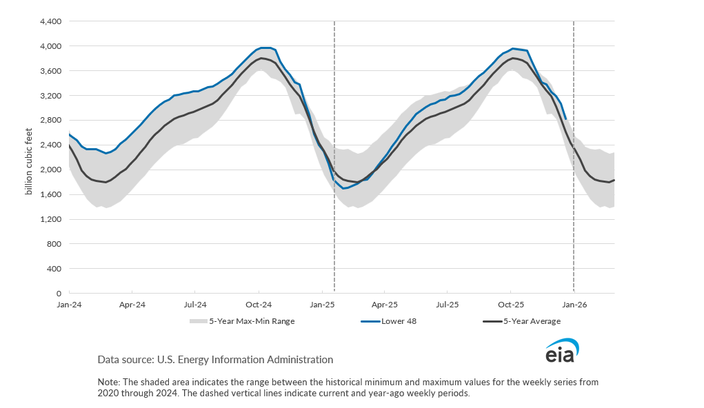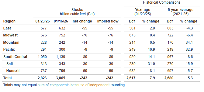 *Working gas in storage was 2,823 Bcf as of Friday, January 23, 2026, according to EIA estimates. This represents a net decrease of 242 Bcf from the previous week. Stocks were 206 Bcf higher than last year at this time and 143 Bcf above the five-year average of 2,680 Bcf. At 2,823 Bcf, total working gas is within the five-year historical range.