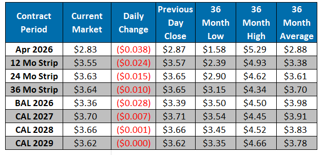 The March contract expired yesterday and settled at $2.97/MMBtu. The NYMEX April contract closed at $2.87/MMBtu yesterday, a $0.04/MMBtu increase from Tuesday’s close. This week, April has averaged $2.86/MMBtu, around $0.12/MMBtu below last week’s average of $2.98/MMBtu. It is trading at $2.83/MMBtu, down $0.04/MMBtu from the previous day’s close. Natural gas prices are breaking lower as aggressive HDD losses and a rapidly warming March outlook weigh on late-season demand expectations. L48 production remains resilient near 108-108.5 Bcf/d, with NE output climbing back toward 36 Bcf/d even as Permian volumes ease from earlier highs, reinforcing a fundamentally well-supplied backdrop. LNG feedgas nominations continue to run strong near 19.8 Bcf/d, with Golden Pass advancing toward initial liquefication after recent FERC approvals, while Mexican exports hold near 6 Bcf/d and Canadian imports remain modest. ResComm demand is softening as temperatures moderate across much of the East and MW and extended-range guidance continues to trend warmer across key consuming regions. With production steady and weather turning less supportive, the market appears increasingly focused on the seasonal shift toward injection dynamics and a softer early-spring demand profile.
