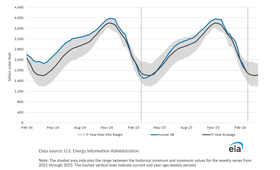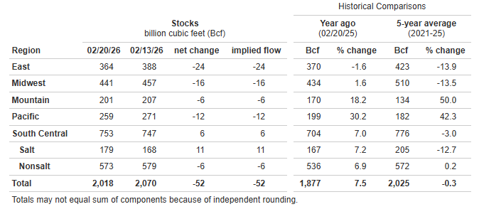 *Working gas in storage was 2,018 Bcf as of Friday, February 20, 2026, according to EIA estimates. This represents a net decrease of 52 Bcf from the previous week. Stocks were 141 Bcf higher than last year at this time and 7 Bcf below the five-year average of 2,025 Bcf. At 2,018 Bcf, total working gas is within the five-year historical range.