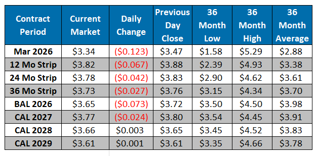 The NYMEX March contract closed at $3.47/MMBtu yesterday, a $0.15/MMBtu increase from Tuesday’s close. This week, March has averaged $3.34/MMBtu, around $0.61/MMBtu below last week’s average of $3.94/MMBtu. It is trading at $3.34/MMBtu, down $0.12/MMBtu from the previous day’s close. Natural gas prices moved higher in recent sessions as strong cash markets helped pull futures upward, though gains moderated as production continued to recover following January freeze-offs. L48 output has rebounded to roughly 108 Bcf/d, with NE volumes improving and Haynesville production now exceeding pre-freeze levels, supporting expectations that overall supply returns to 109-110 Bcf/d by mid-February. LNG feedgas nominations remain robust near 19.3-19.5 Bcf/d, with flows largely normalized across the complex despite a modest DoD dip at Freeport that has not been accompanied by a decline in power burn. ResComm demand is little changed DoD, as stronger heating demand in the NE is offset by weaker conditions in the MW and South, though demand in the NE is expected to strengthen over the weekend before easing later next week. Canadian imports remain elevated, averaging ~7.7 Bcf/d over the past week, while Mexican exports continue to firm near 6-6.5 Bcf/d, reinforcing a near-term balance that remains tight even as supply recovery begins to cap sustained upside.