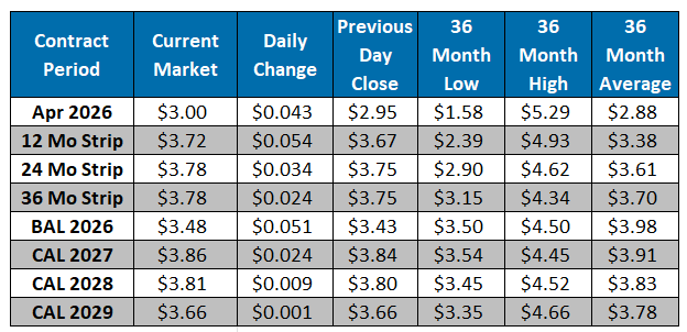 The NYMEX April contract closed at $2.95/MMBtu yesterday, a $0.01/MMBtu increase from Tuesday’s close. This week, April has averaged $2.94/MMBtu, around $0.13/MMBtu below last week’s average of $3.08/MMBtu. It is trading at $3.00/MMBtu, up $0.04/MMBtu from the previous day’s close. Natural gas prices remain under pressure as the market transitions into injection season, with warmer weather continuing to erode late-season heating demand across key consuming regions. L48 production remains strong near 109-110 Bcf/d, with recent gains in the Permian and Haynesville reinforcing a well-supplied backdrop. Forecast revisions continue to trend warmer overall, keeping ResComm demand subdued despite a brief cold shot expected over the weekend. LNG feedgas nominations have strengthened to ~20 Bcf/d, supported by the anticipated start-up of Train 5, while Mexican exports remain steady near 6.5 Bcf/d and Canadian imports have declined on weaker demand. With storage now essentially in line with five-year levels and injections expected to begin imminently, the market appears increasingly focused on shoulder-season fundamentals, where steady supply and soft demand continue to point to a relatively loose balance.
