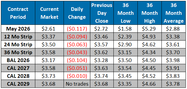 The NYMEX May contract closed at $2.72/MMBtu yesterday, a $0.03/MMBtu increase from Tuesday’s close. This week, May has averaged $2.70/MMBtu, around $0.07/MMBtu above last week’s average of $2.63/MMBtu. It is trading at $2.61/MMBtu, down $0.11/MMBtu from yesterday’s close. Supply has continued to ease through April, with production averaging ~109.5 Bcf/d for the month vs. ~111 Bcf/d prints early on – declines concentrated in the Northeast, Midcon, and non-Permian Texas, where weaker regional pricing is biting. EQT reinforced the theme on its earnings call, citing “tactical curtailments” in the Marcellus during shoulder season and flagging the potential for larger fall shut-ins if contango supports it. On the demand side, ResComm load remains suppressed as warmer-than-normal weather across the eastern US has pushed 30-day heating demand ~3 Bcf/d below year-ago levels, and weather models have continued to shed HDDs across the 1-15-day window. LNG feedgas is a bright spot at ~20 Bcf/d on the week, with Golden Pass shipping its inaugural cargo and Train 2 targeting late-summer startup. Longer term, China’s retreat from the spot LNG market to COVID-era import lows – reselling cargoes into elevated Iran-war pricing and leaning on Russian/Central Asian pipeline supply – is a caution flag for the demand-growth assumptions underpinning the back of the curve.
