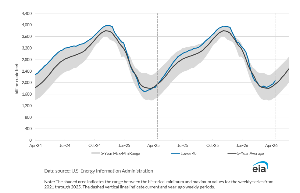 *Working gas in storage was 2,063 Bcf as of Friday, April 17, 2026, according to EIA estimates. This represents a net increase of 103 Bcf from the previous week. Stocks were 142 Bcf higher than last year at this time and 137 Bcf above the five-year average of 1,926 Bcf. At 2,063 Bcf, total working gas is within the five-year historical range.