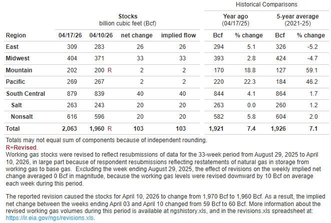 EIA Natural Gas Storage as of 4/17/26, as reported 4/23/26