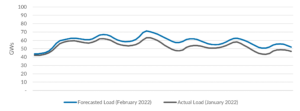 January 18th – ERCOT issued an Operational Condition Notice (“OCN”) for the predicted cold weather event for the ERCOT Region for Thursday, January 20, 2022, through Friday, January 21, 2022. For comparison, the chart below shows the actual load for January 20 through January 22, compared with the load forecast for this Thursday through Saturday: